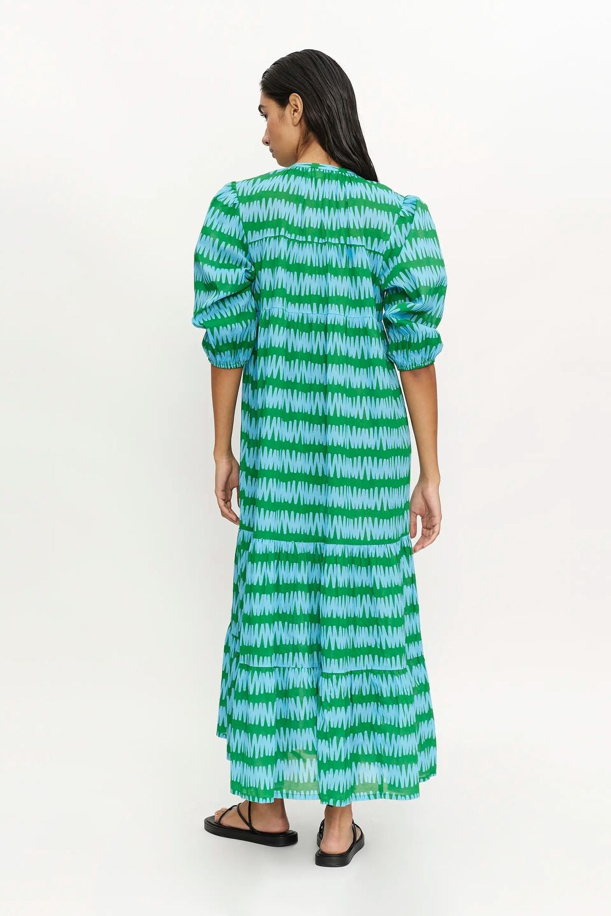 Questo abito lungo in mussola di cotone con stampa a righe verdi e blu "Summer Vibes" è l'opzione perfetta per un look estivo fresco e alla moda. Il suo scollo a V con nastri e le maniche alla francese rifinite in elastico sono comodi e alla moda, mentre la stampa a righe evoca un'atmosfera vivace e luminosa. Che tu stia passeggiando sulla spiaggia o godendoti un pic-nic in giardino, questo abito ti farà sentire elegante e pieno di energia! Presenta scollo a V con nastri e maniche alla francese rifinite in elastico. Modello con tagli e arricciature sotto il petto e sulla gonna. La modella è alta 179 cm e indossa la taglia S. 100% cotone.
