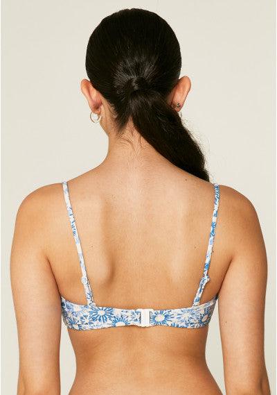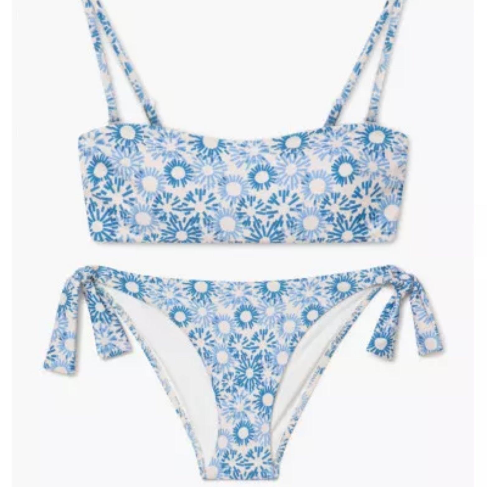 Parte superiore di un bikini a fascia con fantasia floreale a denti di leone. Con scollo dritto, senza ferretto e coppe estraibili. Chiusura posteriore e spalline entrambe regolabili. Foderato. Slip classico di un bikini con fantasia floreale a denti di leone. Chiusura laterale con laccetto regolabile. Foderato. 80% Poliammide 20% Elastan.