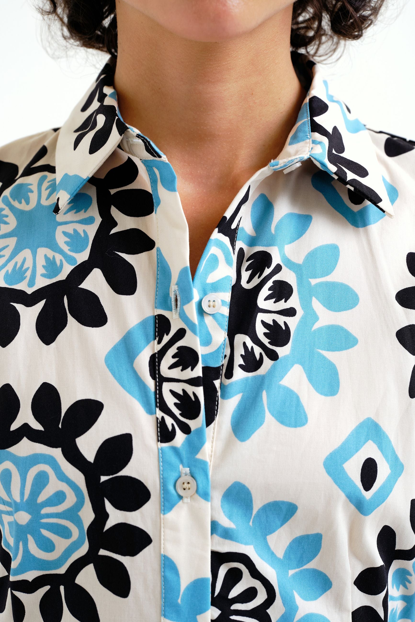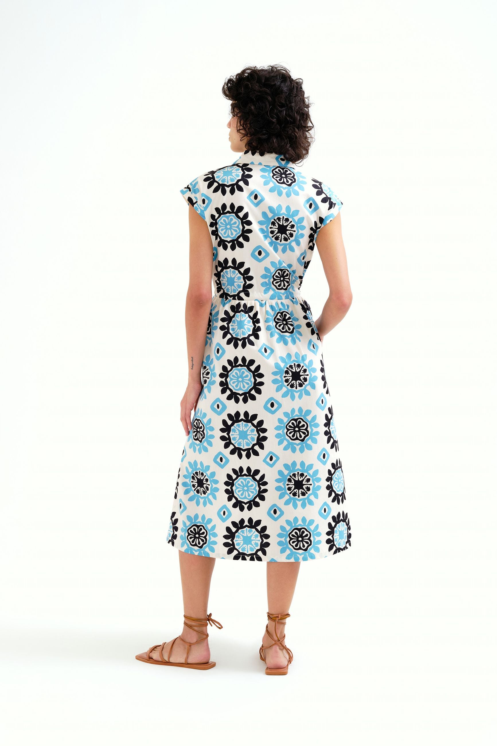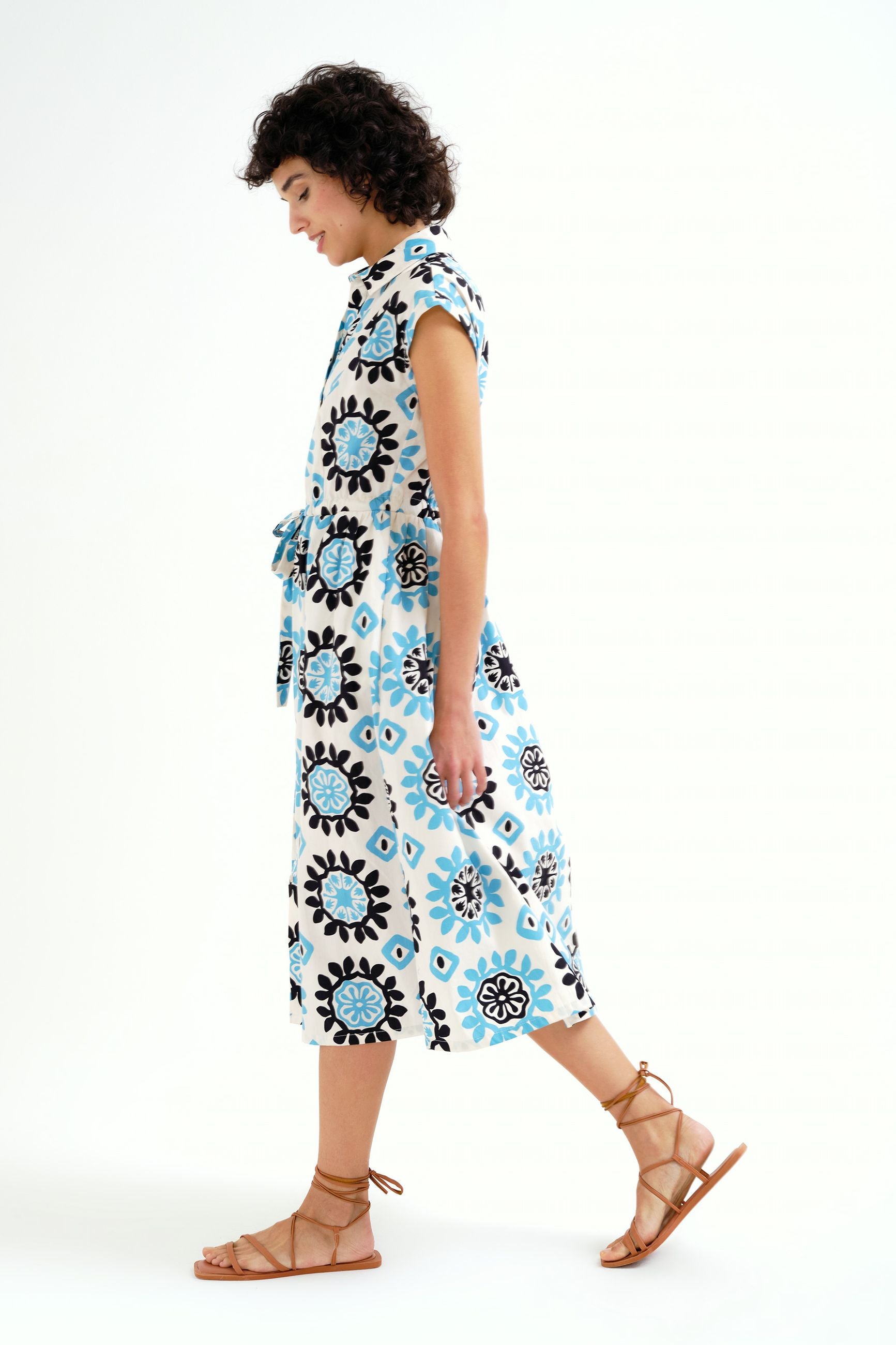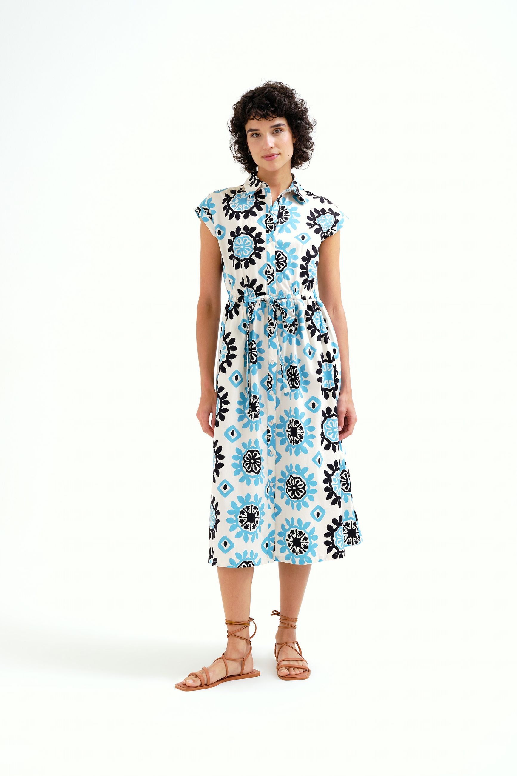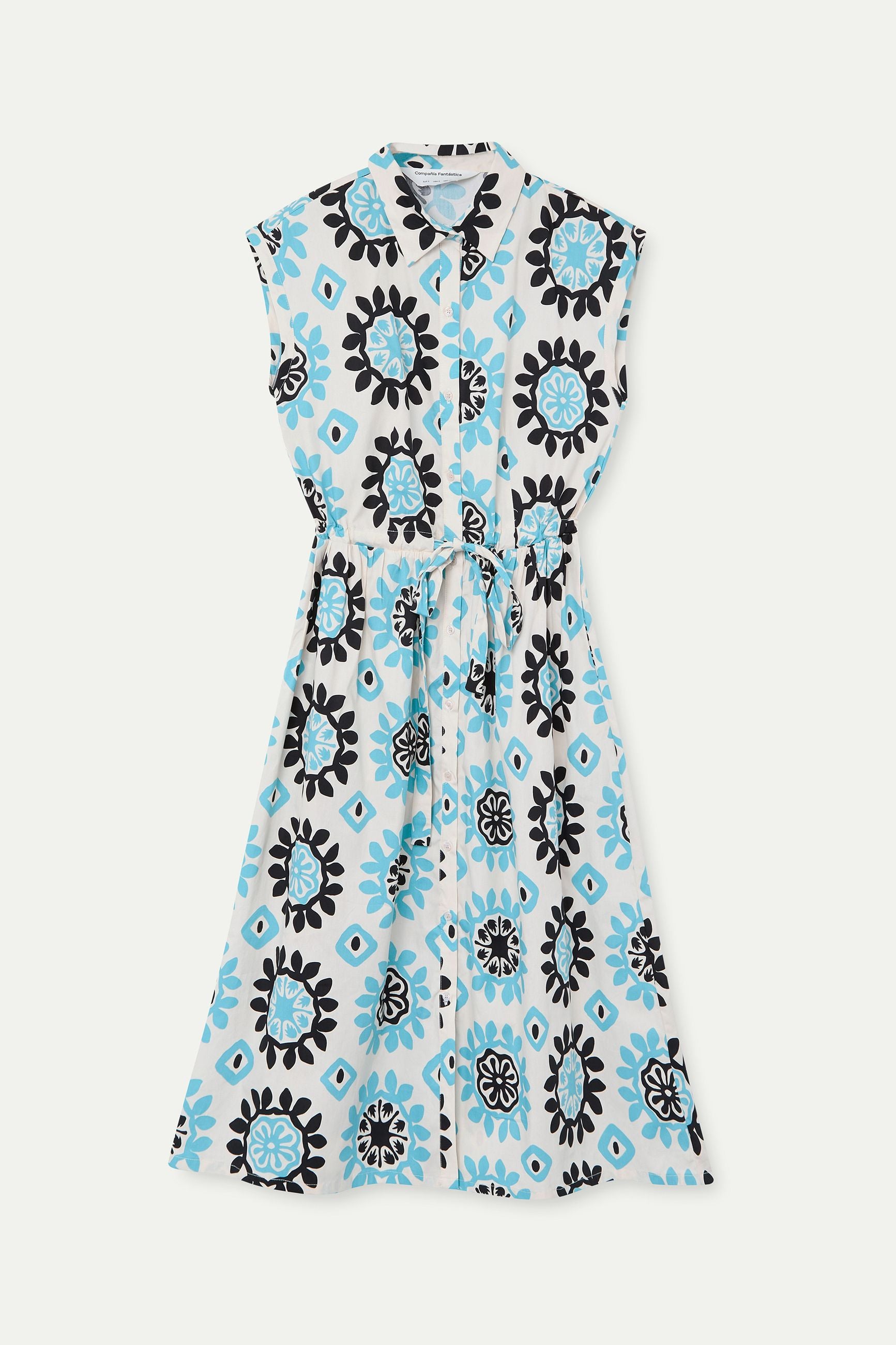 Abito lungo in fantasia, con coulisse in vita, abbottonato davanti, manica corta e colletto a camicia