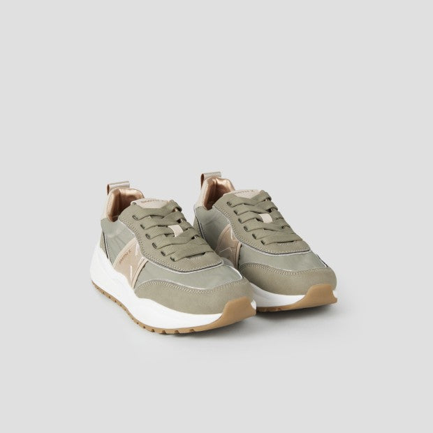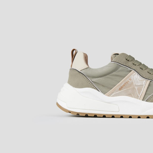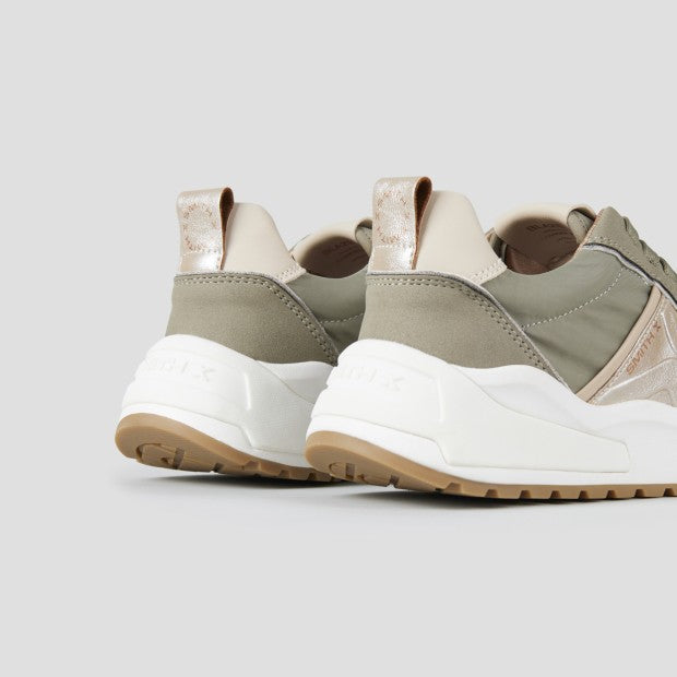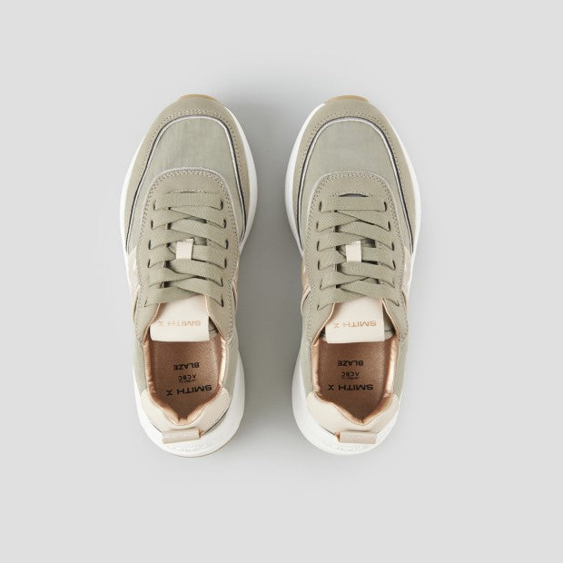 Blaze Donna in nylon verde e dettagli in laminato argento. Pensata per chi non si ferma mai, Blaze unisce estetica sportiva e dettagli premium in una sneaker dal carattere deciso. Linee dinamiche, suola chunky e materiali selezionati si fondono per accompagnarti con stile dalla città al tempo libero. Esprimi la tua personalità passo dopo passo con questa variante in nylon verde e dettagli in laminato oro.Tomaia in nylon e laminato. Logo laterale. Suola running. Suola 40 mm.Soletta interna 10 mm: REF: SXBCBZW-8041-LGD
