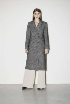 Cappotto sale e pepe a doppio petto in misto lana. Tasche con patta. 70% poliestere 20% lana 4% viscosa. REF: RI1MR006