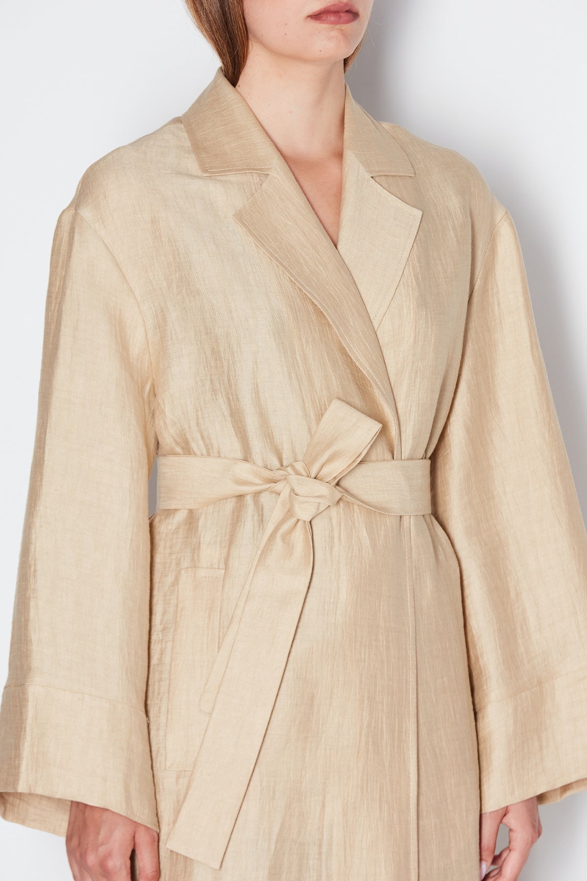 Trench con revers e cintura in vita. Manica ampia. Tasche sul fianco. Senza bottoni. Sfodreato. 88% lino 12% poliamide.