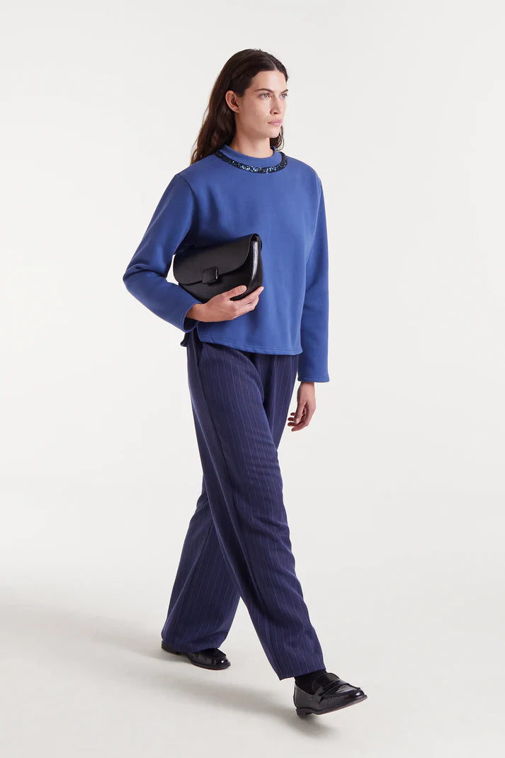 Felpa girocollo blu con dettaglio paillettes sul collo. REF: 53C/12024