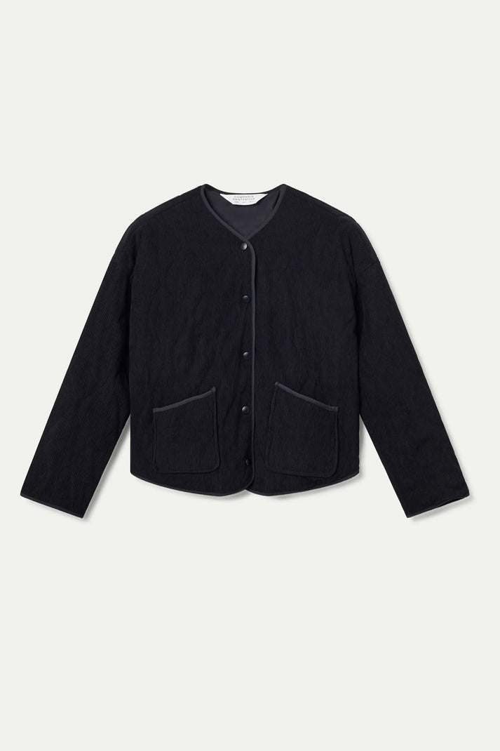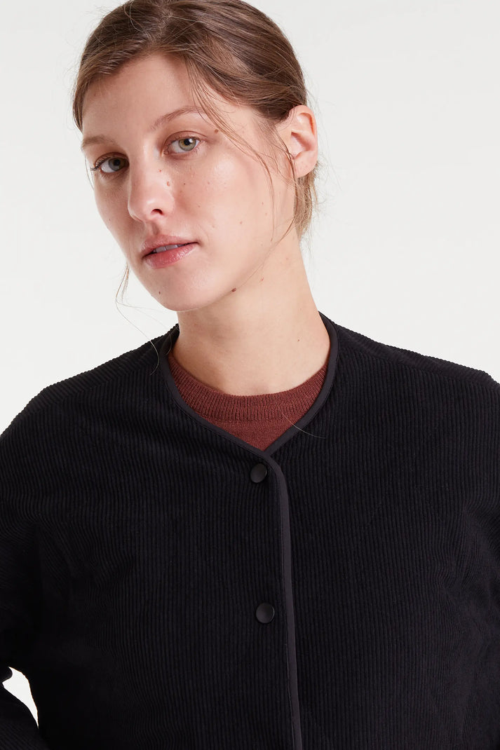 Giacca in velluto a coste nere. Scollo a V e maniche lunghe. Chiusura frontale con bottoni automatici. Tasche laterali. Spalle leggermente scese. REF: 53C/11078