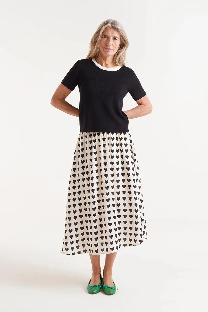 Top nero in maglia fine. Con girocollo bianco a contrasto e maniche corte. Particolare delle finiture in costina.