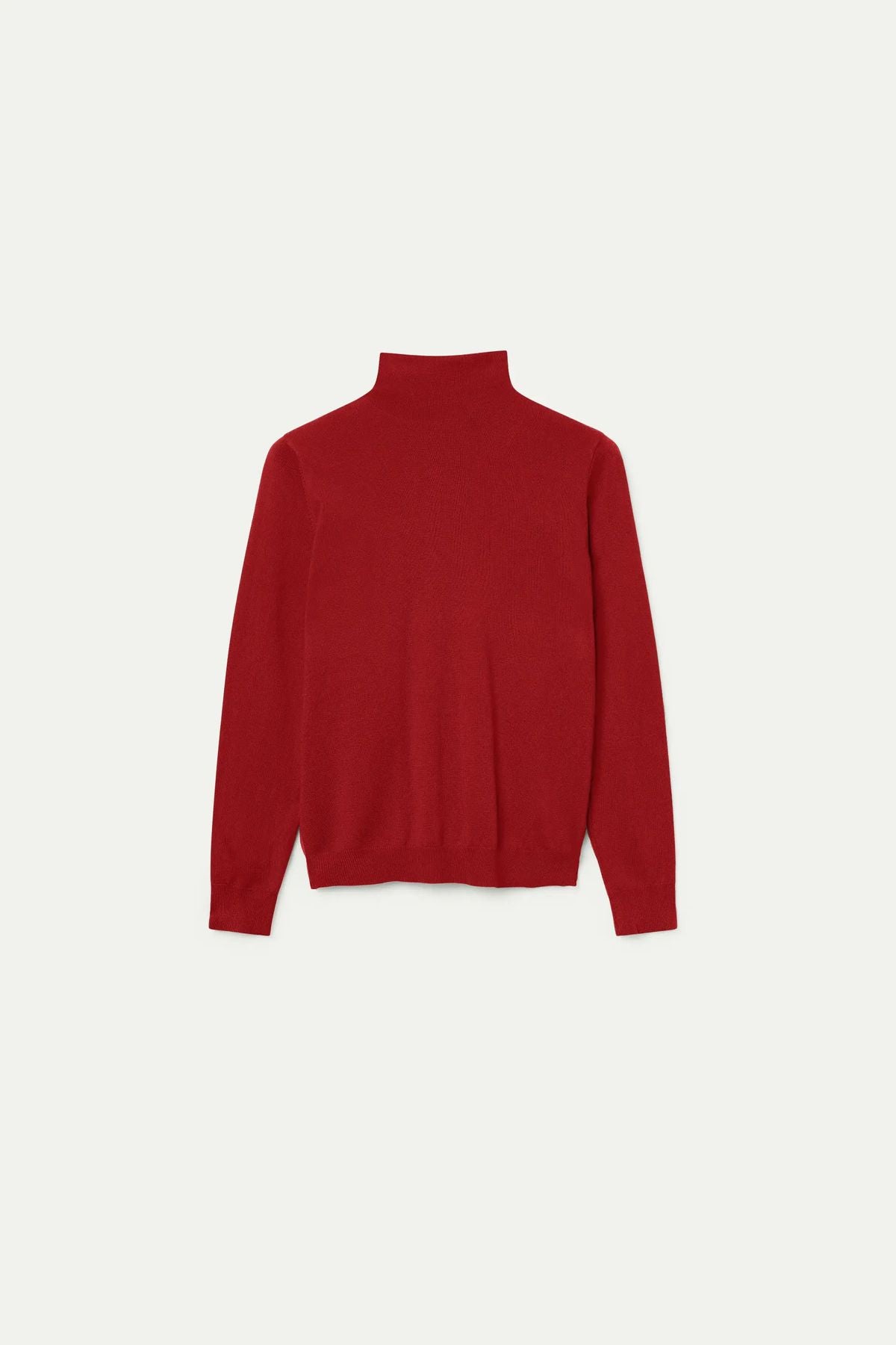 Maglione lavorato a maglia rosso. Con collo alto e maniche lunghe. La modella è alta 174 cm e indossa la taglia S.