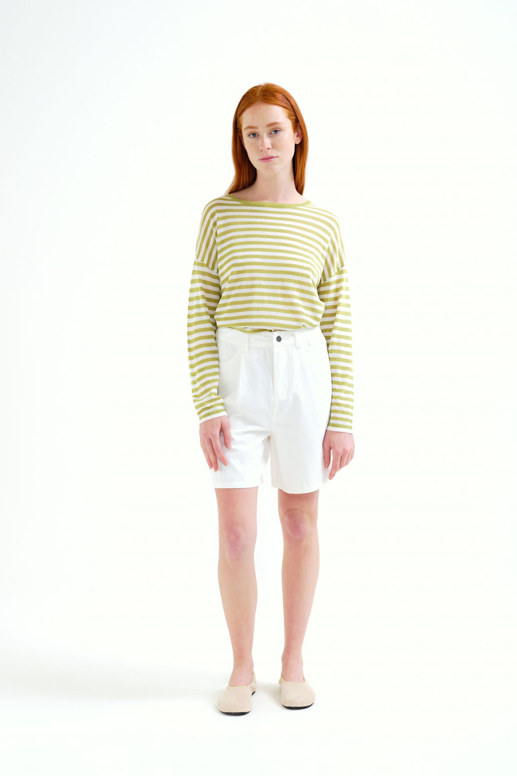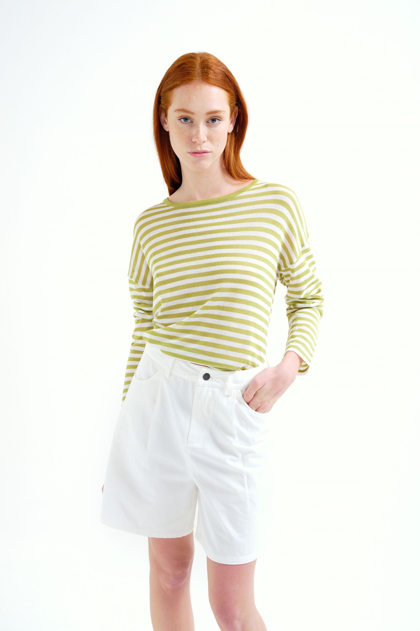 Maglione lavorato a maglia a righe bianche e verdi. Scollo rotondo e maniche lunghe. Spalle leggermente scese. Dettagli con finiture a costine