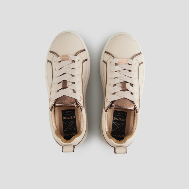 Stone Donna in avorio e dettagli in laminato bronzoPulita, lineare, intramontabile. STONE è la sneaker minimal firmata Smith X, che unisce spirito urbano e gusto raffinato in un design unisex pensato per durare nel tempo, in questa variante in avorio scuro con dettagli in laminato bronzo. Logo sul lato. Suola 50 mm. Soletta interna 10 mm. REF: SXBCHSW-9502-DIZ