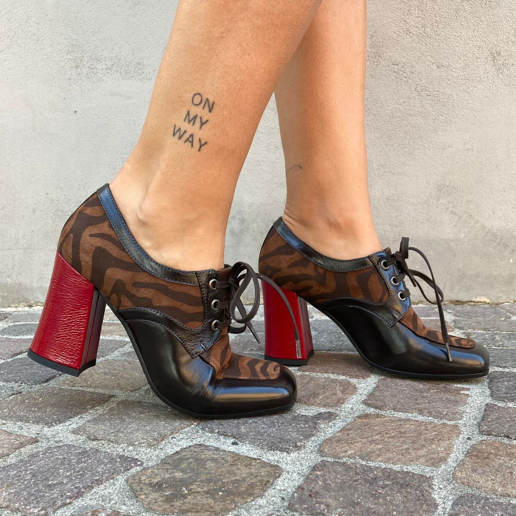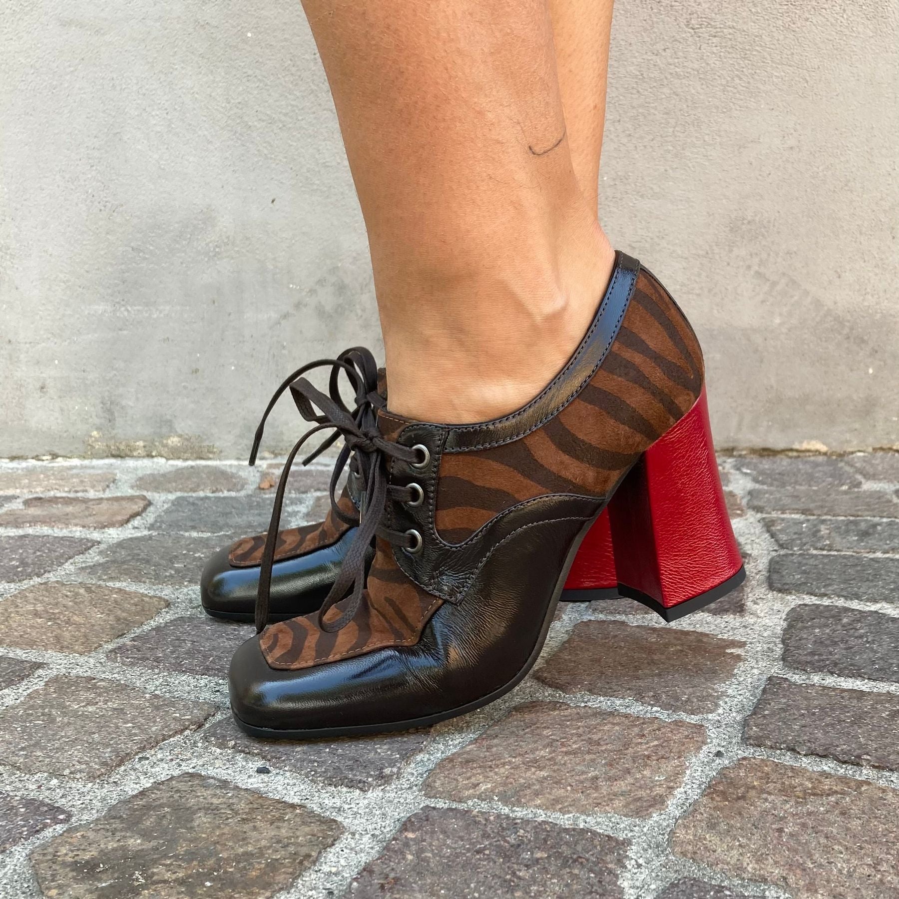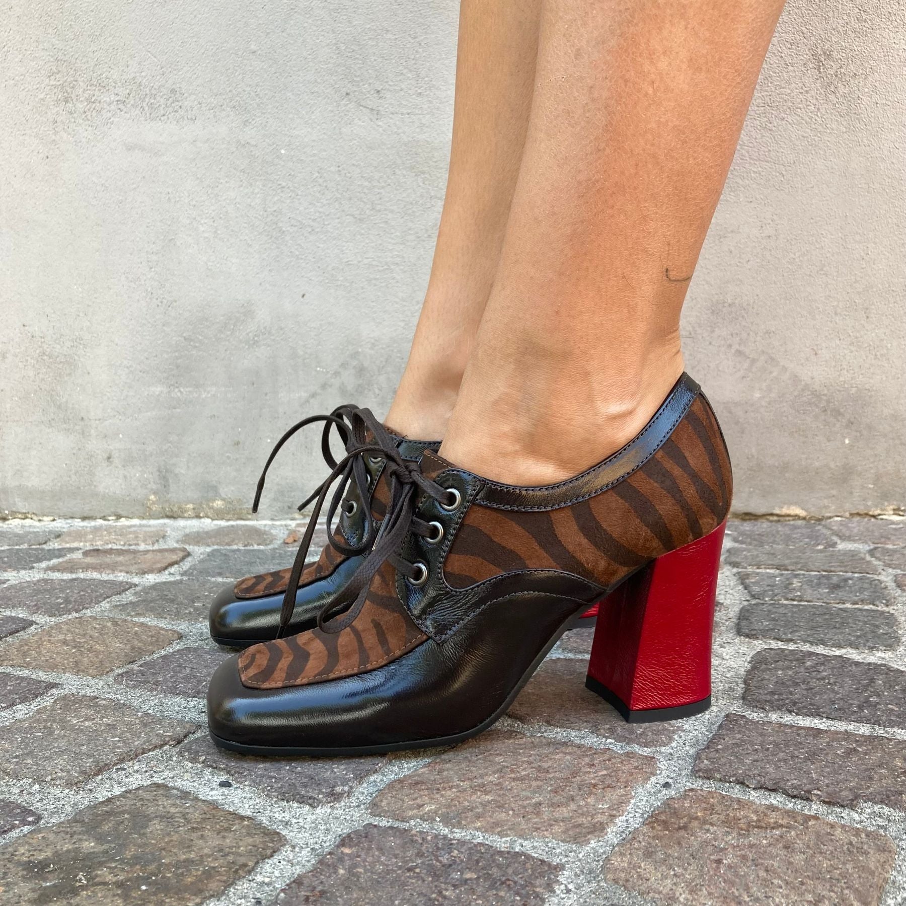 Il Tronchetto Allacciato Zebra Marrone Marc Ellis Ë l'ideale per tutte le donne che desiderano essere femminili con stile. Realizzato in pelle stampata zebra marrone e vernice in testa di moro, con punta squadrata. Tocco originale che caratterizza la scarpa, Ë il tacco di 9 cm in vernice rossa a contrasto, molto confortevole e unico nel suo genere. E' una scelta ideale per avere un look di classe, sempre in perfetto stile. Tacco di 9 cm fasciato in pelle. Tomaia e fodera in vera pelle. Chiusura con lacci. Fondo di gomma. Made in Italy