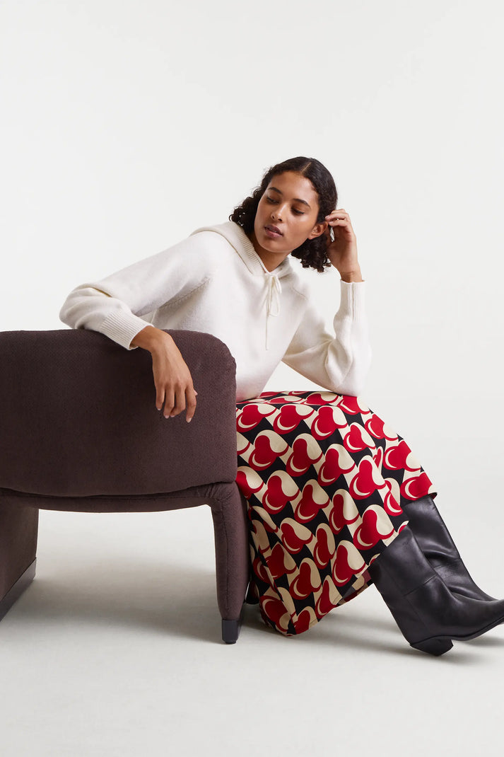 Maglione bianco in maglia fine con cappuccio regolabile con coulisse e maniche lunghe. Spalle leggermente scese. Dettagli a coste.